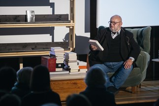 Auf der Bühne befindet sich ein Stapel Bücher rund um das Thema des Festivals: Spät- und Meisterwerke, Unvollendetes, Größenwahnsinniges, Perfektionistisches, Gescheitertes.