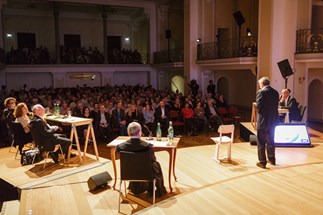Ein professionell geführtes Gerichtsverfahren: Die Auflösung aller Vorarlberger Rheintalgemeinden und die Gründung einer neuen gemeinsamen Stadt. Ein Prozess mit den besten Argumenten. Das Publikum stimmt zum Schluss ab. Ein brechend voller Saal mit Bürgermeistern, Regionalpolitikern und interessierten Bürgerinnen und Bürgern.
