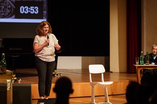 Das Urteil fällte das Publikum in der Rolle der Geschworenen. (Überraschung: Gemeindezusammenlegung und Stadtgründung!) Eine komplexe rund 2stündige Dramaturgie mit Pecha-Kucha-Elementen, Plädoyers, Kreuzverhören, musikalischen Zusammenfassungen und einer Summ-Abstimmung des Publikums. Keine Probe, aber ein intuitiv wirkendes, dichtes Regelwerk im Hintergrund, das ein komplex-elegantes Zusammenspiel ermöglichte.